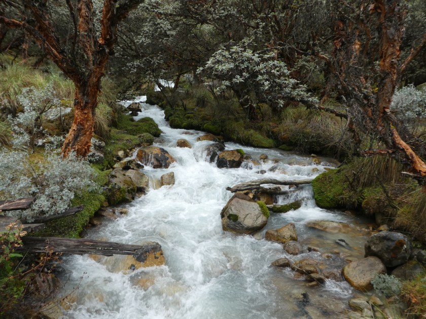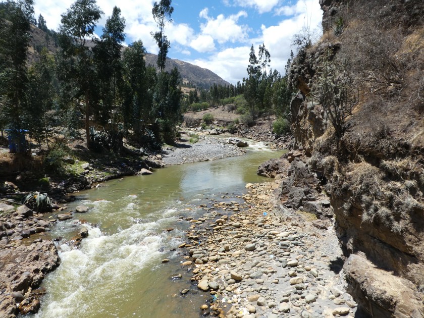 Nach der anstrengenden Tour gestern wollte ich es heute etwas ruhiger angehen lassen, aber trotzdem wenigstens eine kleine Tour machen. So nahm ich, nach Ausschlafen und Frühstück, um 10.30 Uhr einen Bus Richtung Süden, der mich an der Puente Santa Cruz absetzte. Von dort startet der Trek zur Laguna Wilcacocha, für den 2 Stunden rauf und 1 Stunde wieder hinunter angegeben waren, also recht kurz und auch nur 400hm. Am Fluss ging es los: