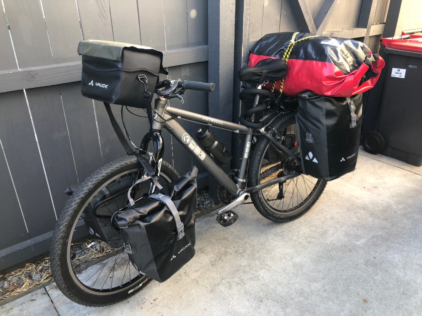 Da ich vor Aufregung vor dem Start meiner Neuseeland-Rundfahrt schlecht geschlafen hatte, machte mir das Aufstehen um 6.00 Uhr gar nichts aus. Gepackt hatte ich gestern schon, und so ging es nach einem Restefrühstück und doch etwas zeitaufwändigem Bepacken des Fahrrads um 7.30 Uhr bei schönstem Sonnenschein los. So sieht mein Rad vollgepackt aus: