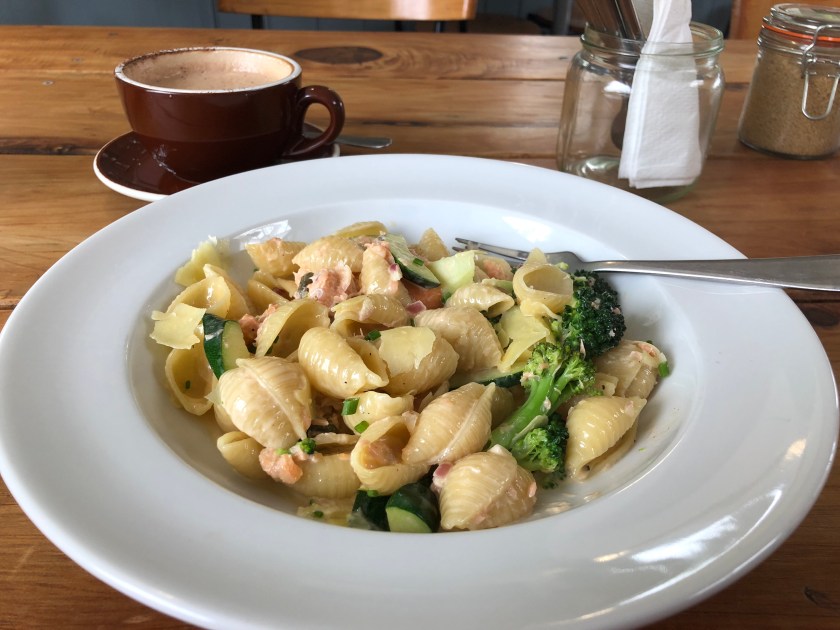 In Motueka beschloss ich deshalb (und weil ich Hunger hatte), in Gebbie’s Garden Café einzukehren und mich mit Pasta und diversen Heißgetränken zu stärken: