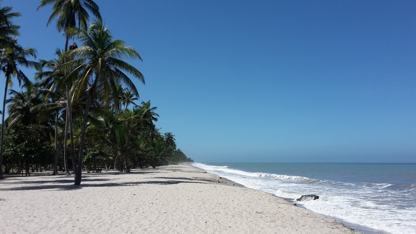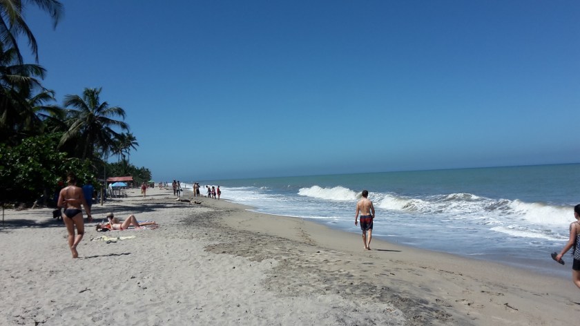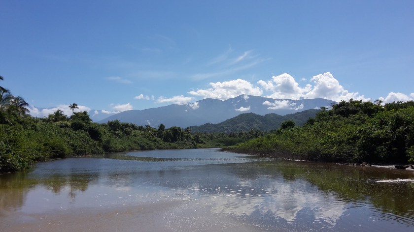Da ich etwas abgelegen wohne, sind es ca 20 Minuten bis dahin, wo alle Touristen (und sämtliche Strandbars) sind und weitere 40 Minuten durch den weichen Sand zu meinem Lieblingsplatz, der Flussmündung des Rio San Salvador – da ist dann kein Mensch mehr. Ich liebe diesen Platz, denn man kann erstens in Meer UND Fluss baden und hat zweitens einen wunderbaren Ausblick aufs Meer in die eine Richtung und den Dschungel und die Berge der Sierra Nevada in die andere Richtung – ein Traum!