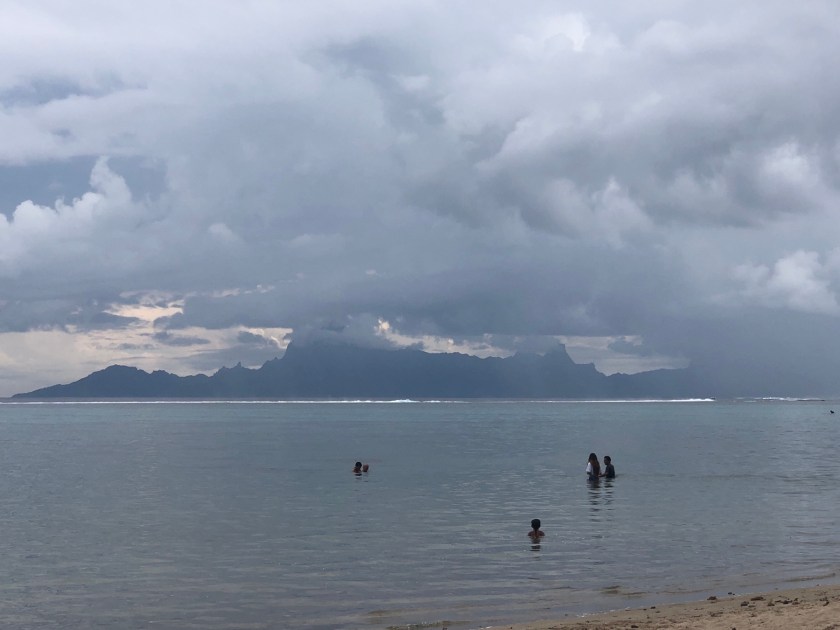 Die Nachbarinsel Moorea, in Wolken gehüllt.