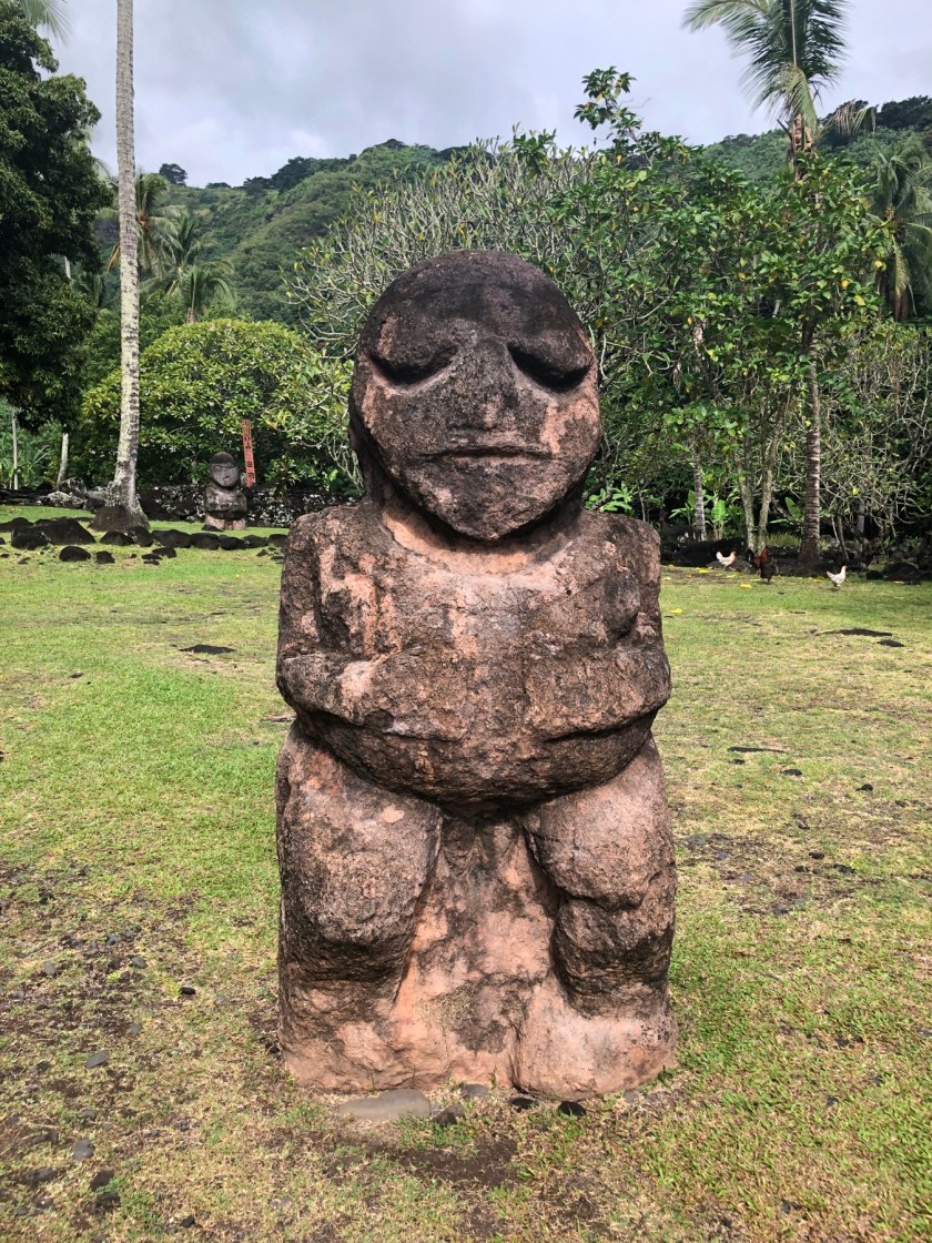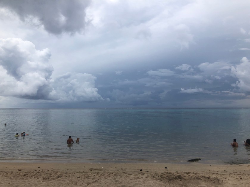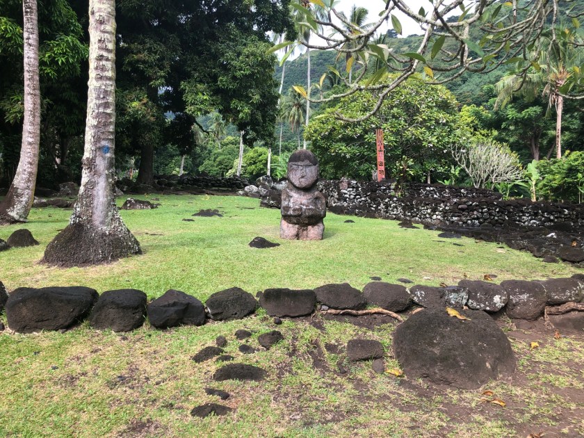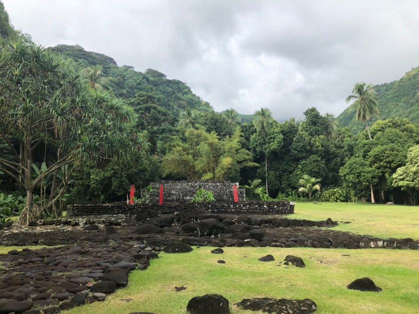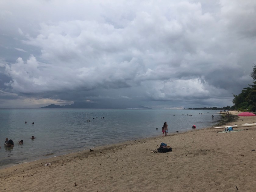 Unwetter über dem Meer.Da das Wetter, wie man auf den Bildern erkennen kann, nicht allzu schön war, machten wir uns nach ausgiebigem Bad im warmen Wasser und anschließendem Trocknen wieder auf den Weg zu unserem nächsten Ziel, dem Marae Arahurahu, einer ehemals heiligen Stätte: