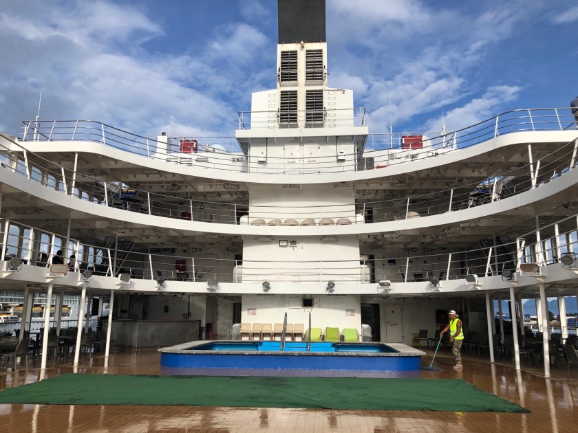 Pavillon am Quai mit Kreuzfahrtschiffen im Hintergrund.