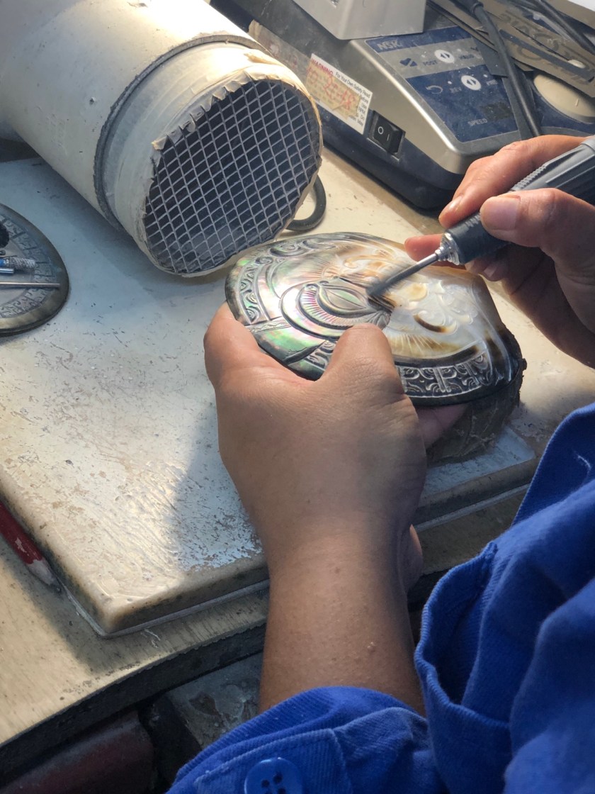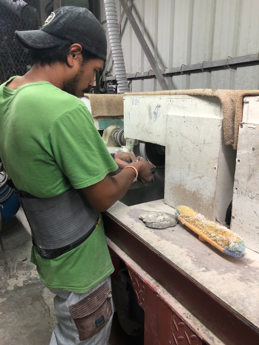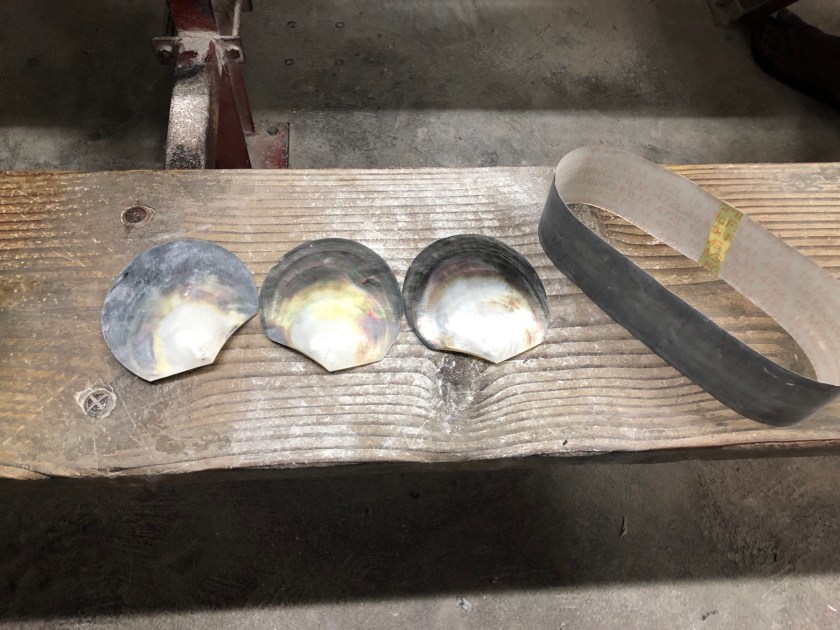 Der erste Arbeitsschritt ist das Schleifen der gesamten Muschel.