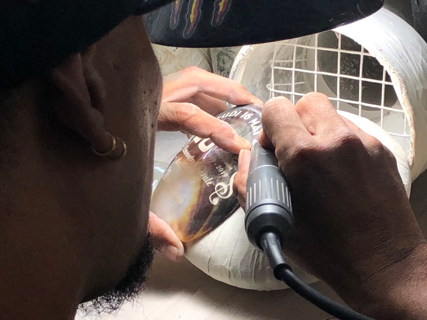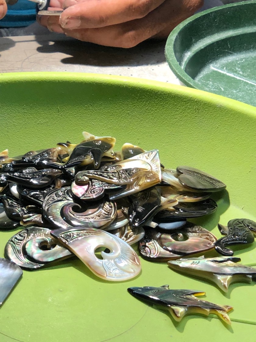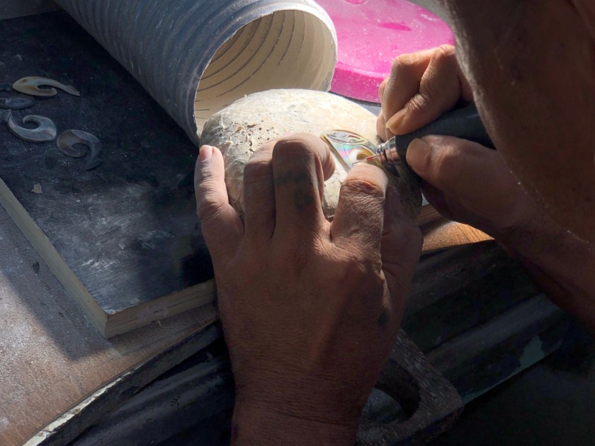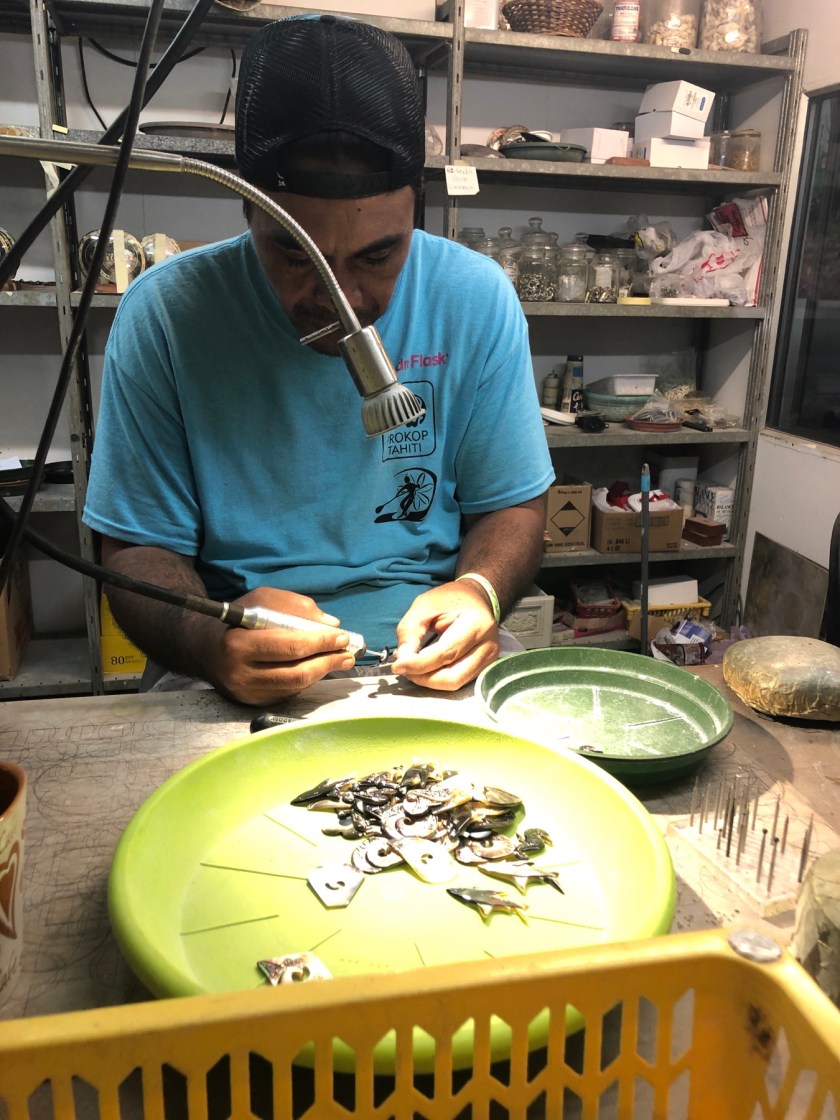 Wir verbrachten einen schönen Tag zusammen mit einem Besuch in einem Austern-Schleifwerk, wo die Muscheln zu echten Kunstwerken weiter verarbeitet werden, Baden am Point Venus Strand und leckerem Dinner an einem Roulotte (Food stand), bevor mich Evelyne und Hugues zum Flughafen brachten. Hier ein paar Eindrücke vom Austern-Schleifen:
