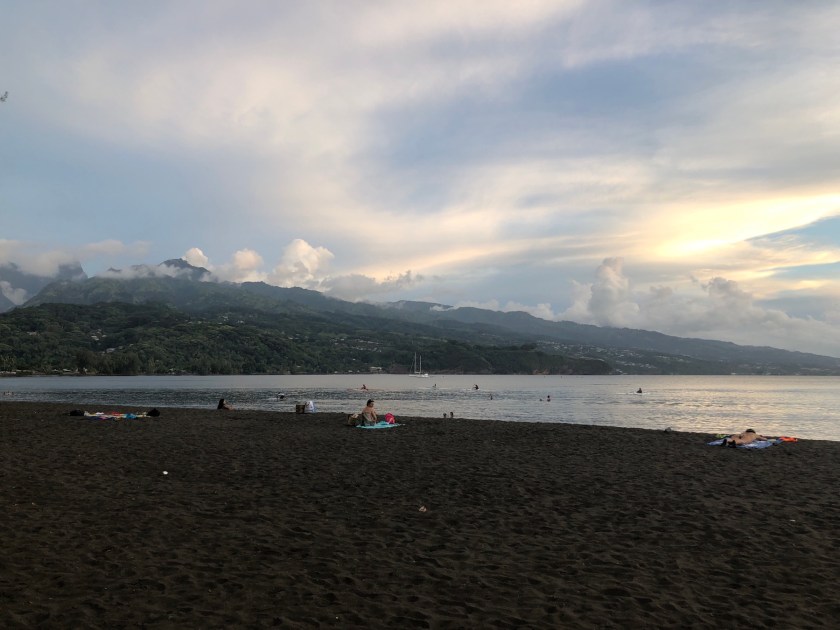 Der schwarze Sandstrand am Point Venus, mit den Bergen Tahitis im Hintergrund.