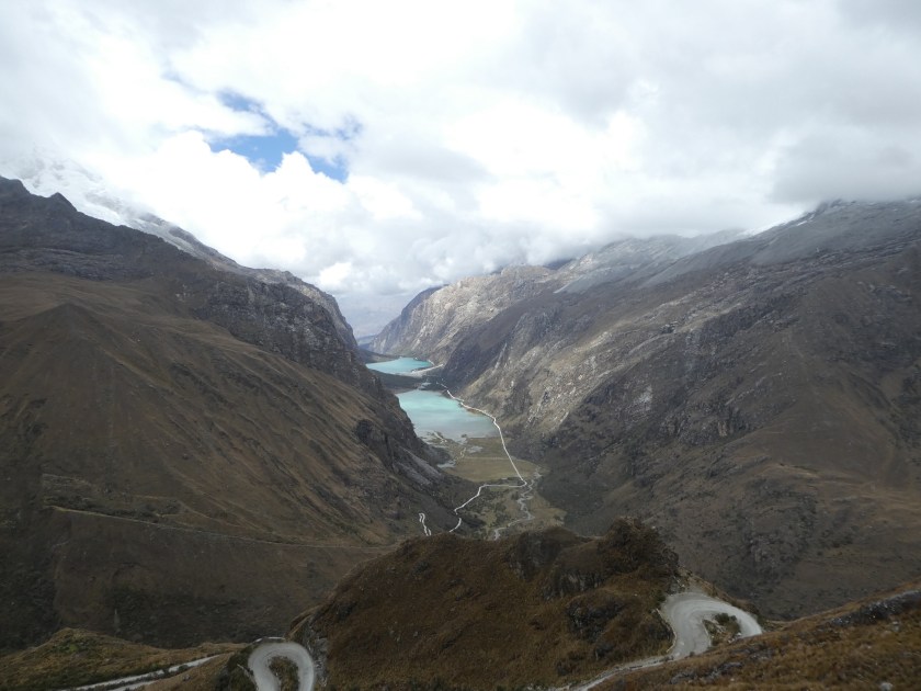 Morgens um 6.00 Uhr ging es los mit dem Bus und noch 8 anderen Leuten, insgesamt also einer 12er Gruppe, zu unserem Startpunkt in Vaquería. Den ersten Teil der Strecke nach Yungay kannte ich schon, da es die gleiche Strecke wie zur Laguna 69 ist, und wieder kamen wir an den beiden Lagunas mit dem unglaublich türkisfarbenem Wasser vorbei – nur diesmal schien die Sonne, deshalb hier nochmal ein Bild mit Sonnenschein 😊.