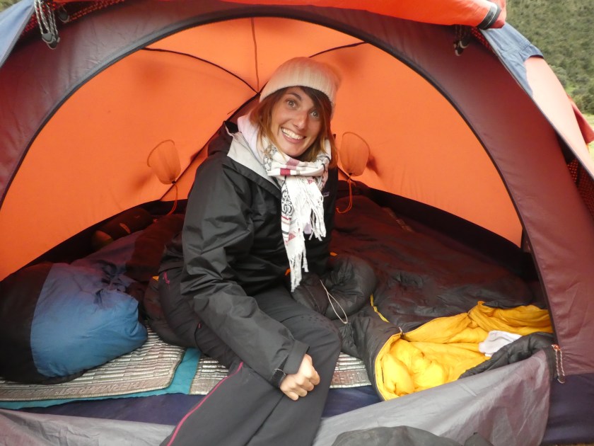 In den Dreimann-Zelten war es zu dritt ziemlich kuschelig (mit Gepäck), aber dafür warm 😜. Meine Zeltgenossen waren die Französin Margo und der Grieche John, hier Margo in unserem „Reich“: