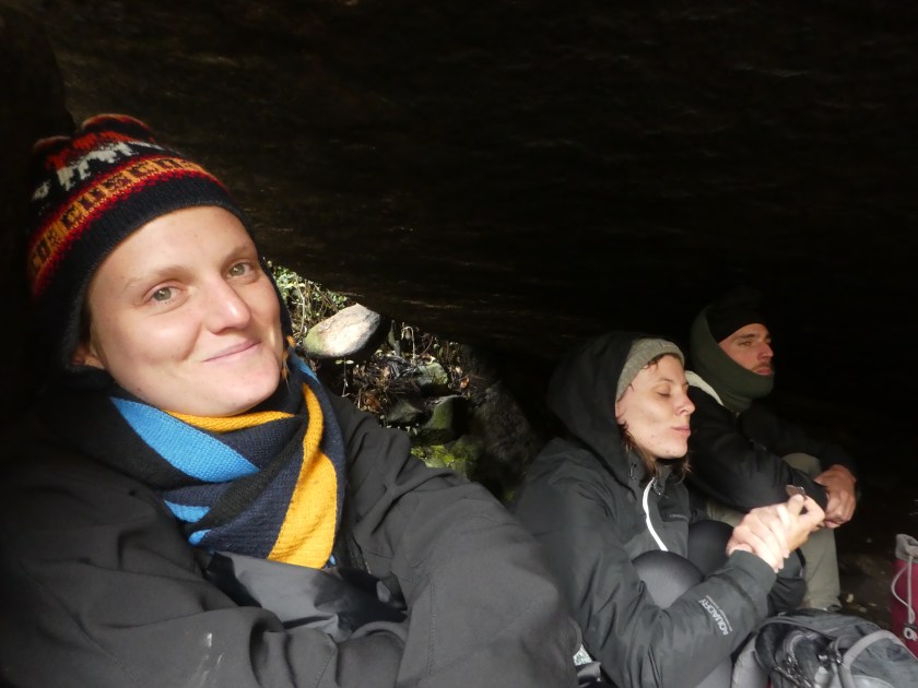 Da ein Teil der Gruppe schneller war als die Donkeys mit unserem Gepäck, brachten wir uns vor dem Regen und der Kälte in einer Höhle in Sicherheit.