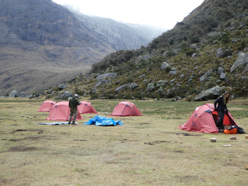 Im Gegensatz zum sehr luxuriösen Salkantay Trek mit Toiletten, Waschbecken und teilweise sogar Duschen gab es hier nichts dergleichen, nur Wiese mit jeder Menge Kuh- und Esel-💩. Das hieß 3 Tage ohne Waschen (wobei die fehlenden Toiletten das größere Problem waren, „gewaschen“ wurden wir täglich vom Regen) 😜. Auch das Essen und das Ambiente konnte mit Salkantay nicht mithalten (war aber trotzdem okay):