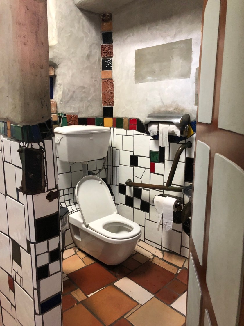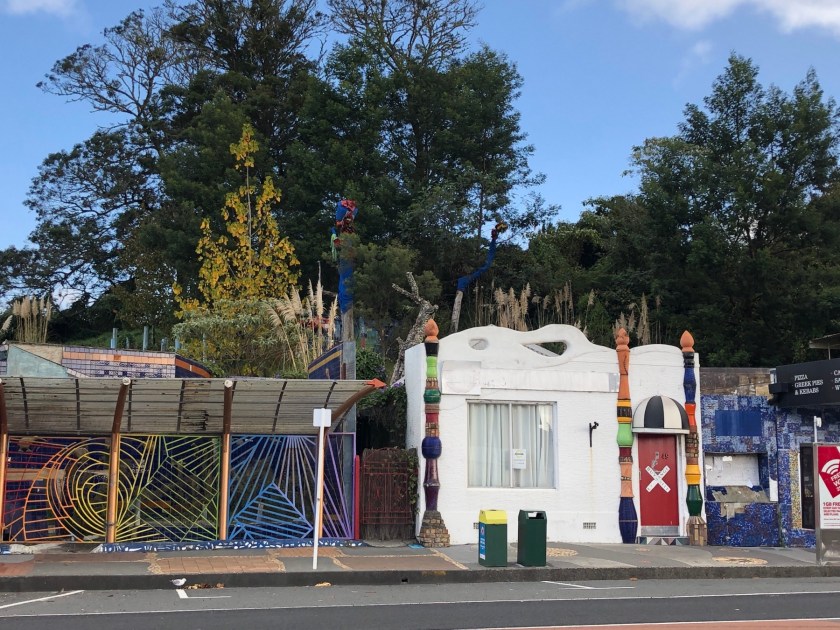 Hundertwasser-Bauwerk: Hintendran entsteht gerade das Kunstmuseum, das Hundertwasser gewidmet ist, der über zwanzig Jahre hier in Neuseeland gelebt hat.
