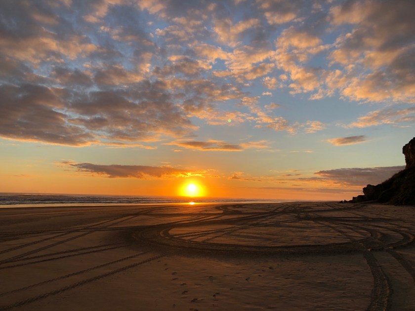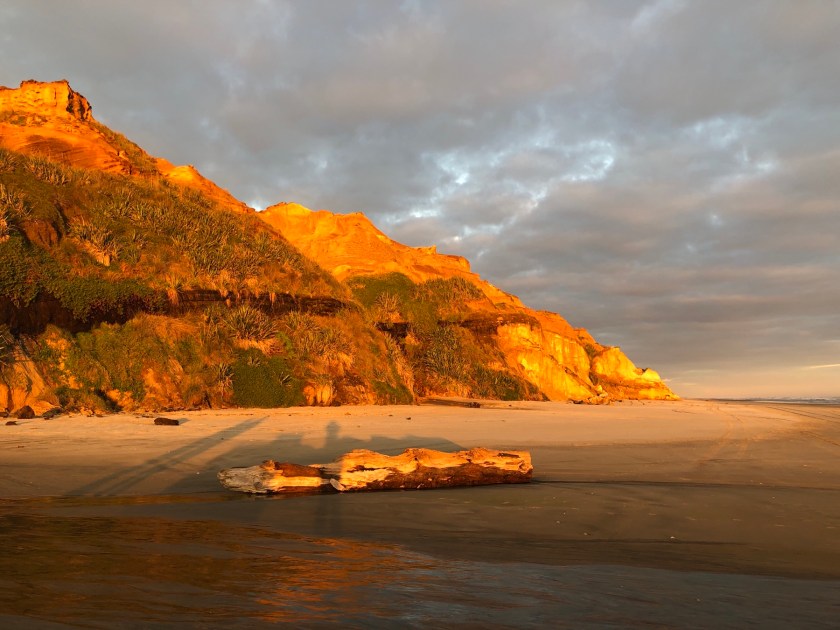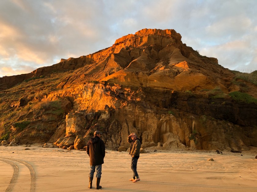 Dort angekommen, luden wir das Auto aus, fuhren schnell zum Einkaufen nach Dargaville, in die nächste Stadt, und kamen dann zurück, um mit Graham, unserem Vermieter, und seinem Hund eine Quattour im Sonnenuntergang am Strand zu machen: